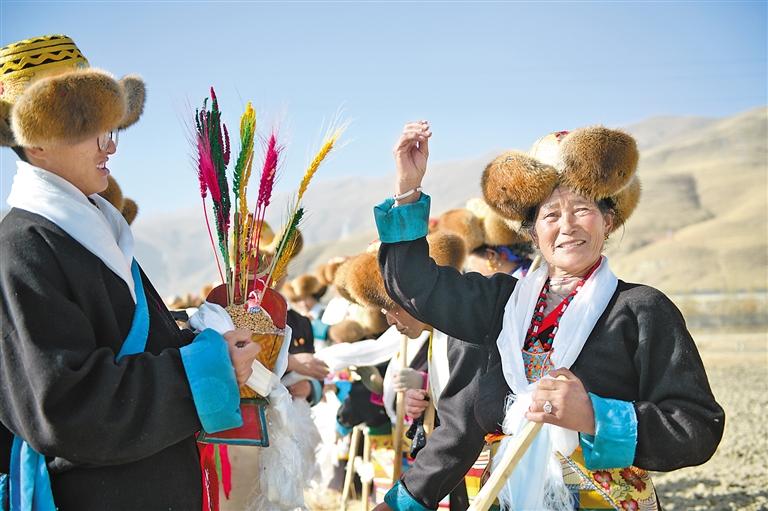 山南市瓊結(jié)縣拉玉鄉(xiāng)村民拋撒糌粑。通訊員 米瑪央金 倫珠澤仁 攝