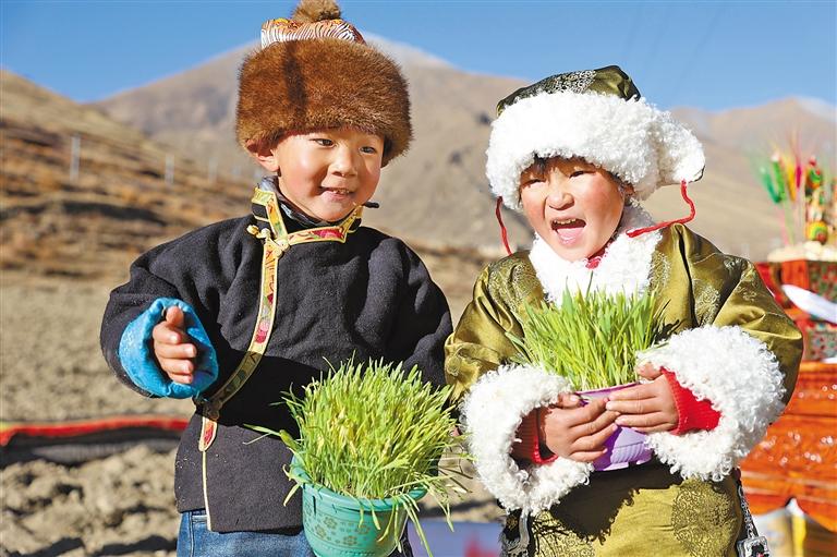 山南市瓊結(jié)縣拉玉鄉(xiāng)的小朋友們手捧青稞苗。通訊員 米瑪央金 倫珠澤仁 攝