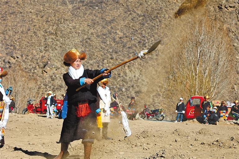 林芝市工布江達(dá)縣工布江達(dá)鎮(zhèn)阿沛村春耕春播儀式上,被推選為“播種者”的次旦拉姆身著盛裝,撒下青稞種子。記者 謝筱純 攝