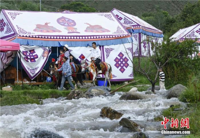 2024年7月28日,市民在位于西藏自治區(qū)拉薩市堆龍德慶區(qū)的達東村“過林卡”。過林卡是藏族人最普遍的休閑娛樂方式,類似于郊游和野餐。中新社記者 貢嘎來松 攝