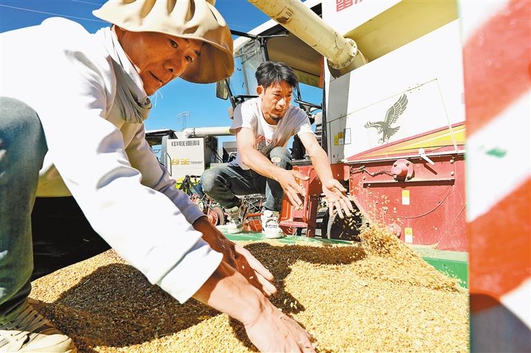 拉薩市墨竹工卡縣唐加鄉(xiāng)莫沖村青稞喜獲豐收。