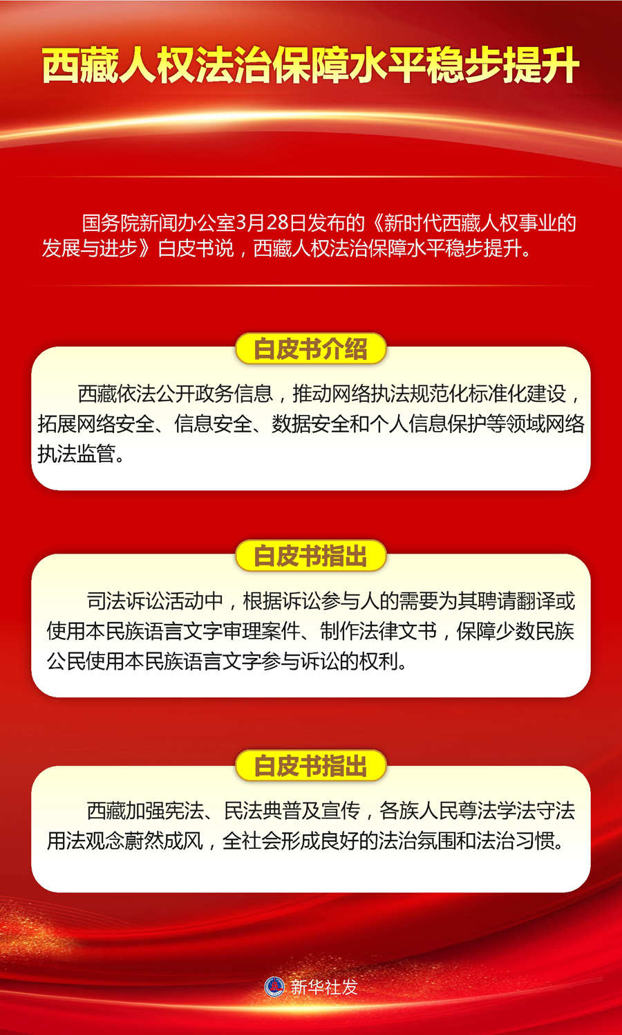 國(guó)務(wù)院新聞辦公室28日發(fā)布的《新時(shí)代西藏人權(quán)事業(yè)的發(fā)展與進(jìn)步》白皮書說,西藏人權(quán)法治保障水平穩(wěn)步提升。