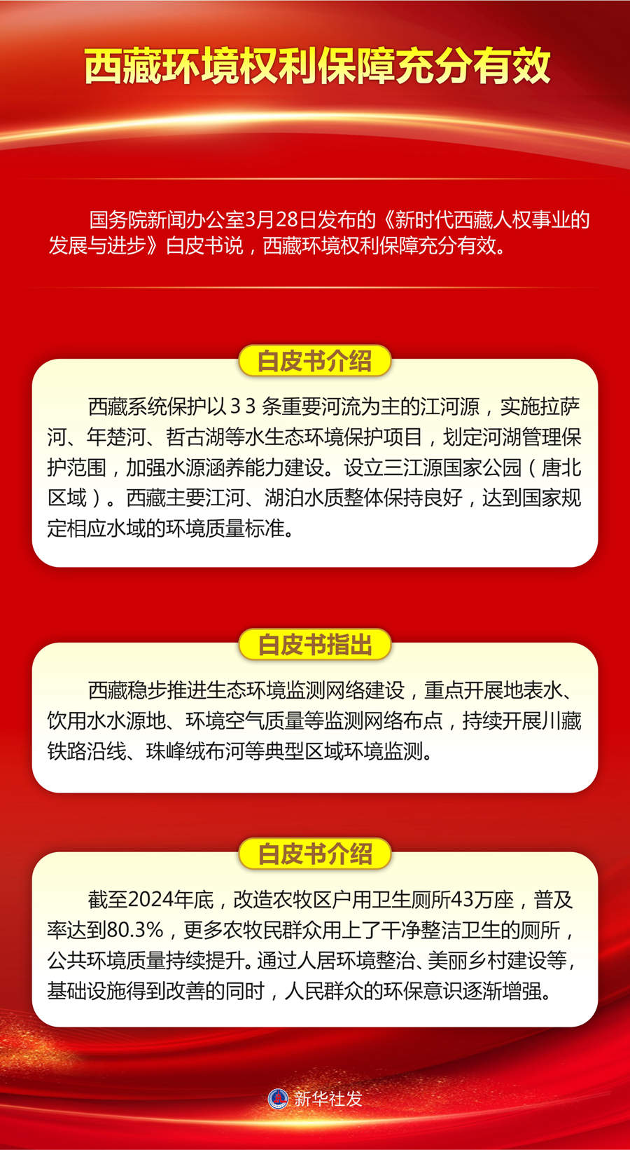 國(guó)務(wù)院新聞辦公室28日發(fā)布的《新時(shí)代西藏人權(quán)事業(yè)的發(fā)展與進(jìn)步》白皮書(shū)說(shuō),西藏環(huán)境權(quán)利保障充分有效。