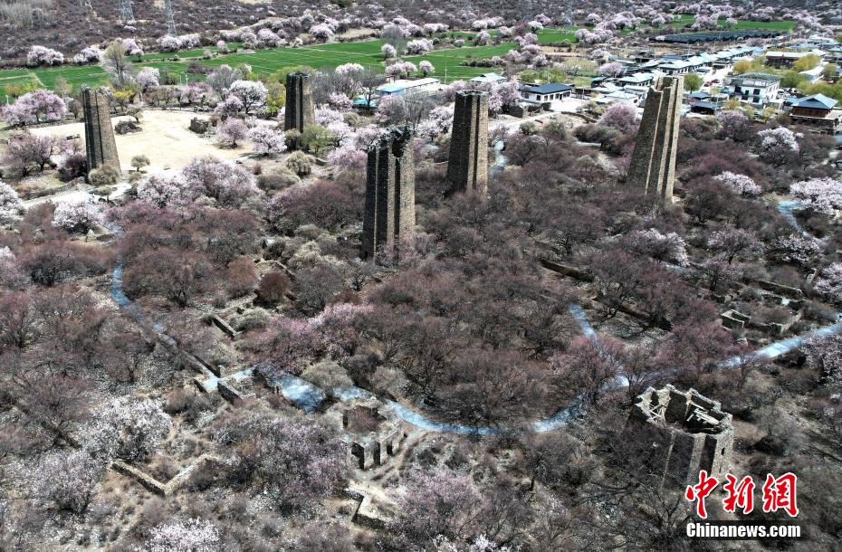 秀巴古堡位于西藏林芝市工布江達(dá)縣,是古代的軍事設(shè)施,距今已有1600多年的歷史。時(shí)下,古堡之下遍布的桃花競(jìng)相綻放,粉白桃花點(diǎn)綴著滄桑古堡,景色壯麗。圖為4月5日,秀巴古堡群下桃花綻放。(無人機(jī)照片)中新社記者 李林 攝