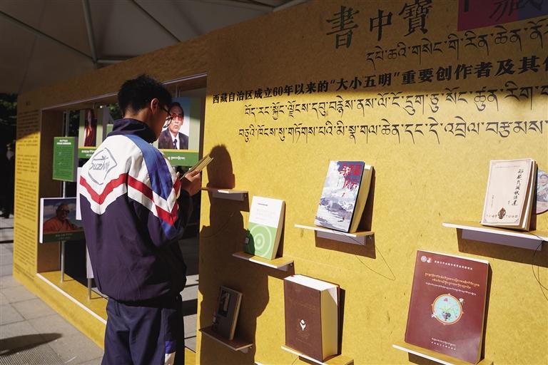 今年的書會(huì)展覽別具一格。在宗角祿康公園舉辦的“書中寶‘藏’——西藏自治區(qū)成立60年以來的重要作家與其著作”展覽,通過圖文、實(shí)物與互動(dòng)相結(jié)合的創(chuàng)新方式,帶領(lǐng)觀眾回顧歷史,深入探尋西藏文化的深厚底蘊(yùn)。從歷史文脈到當(dāng)代審美,展覽呈現(xiàn)雙重維度——既追溯歷史又展現(xiàn)當(dāng)下。吾要(嘎瑪·多吉次仁)書籍設(shè)計(jì)藝術(shù)展則首次在拉薩展示了這位國內(nèi)著名書籍設(shè)計(jì)師多年積累的各類作品,讓觀眾領(lǐng)略到書籍設(shè)計(jì)的獨(dú)特魅力。
