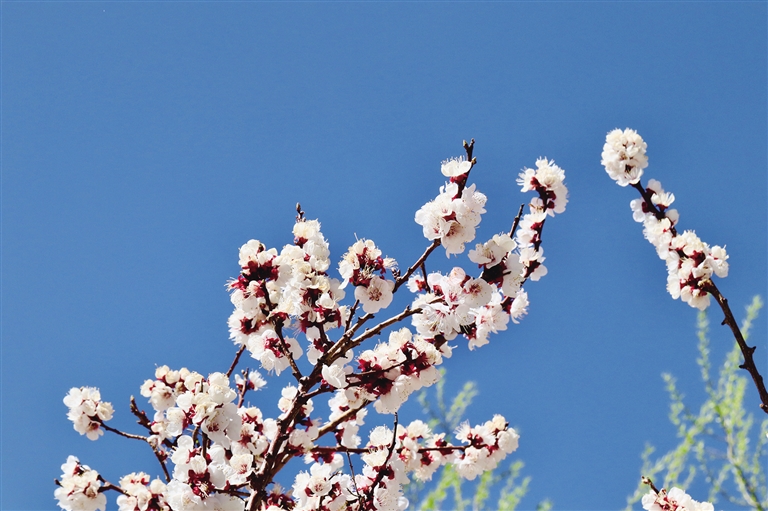 路邊的榆葉梅率先吐蕊,粉白的花朵簇?fù)碓谥︻^,遠(yuǎn)看如粉白的云朵飄浮在街道兩側(cè)。沿著道路慢慢走,幾株桃樹穿插在其中,深紅淺粉交錯,以藍(lán)天為背景,舉起手機(jī)隨手一拍都是高清壁紙級別的美景。陽光正好時,能看到在花樹下曬太陽的老奶奶,她們?yōu)檫@浪漫的春日景色增添了一絲生活的氣息。