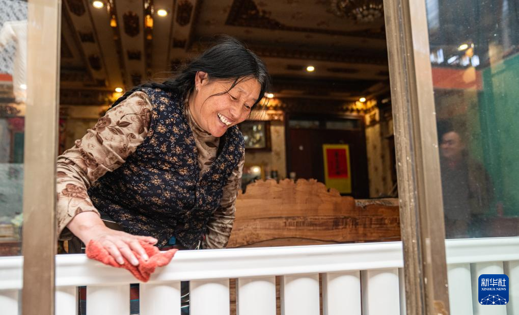 4月26日,那曲市團結(jié)小區(qū)居民在擦拭暖氣片。新華社記者 丁增尼達 攝