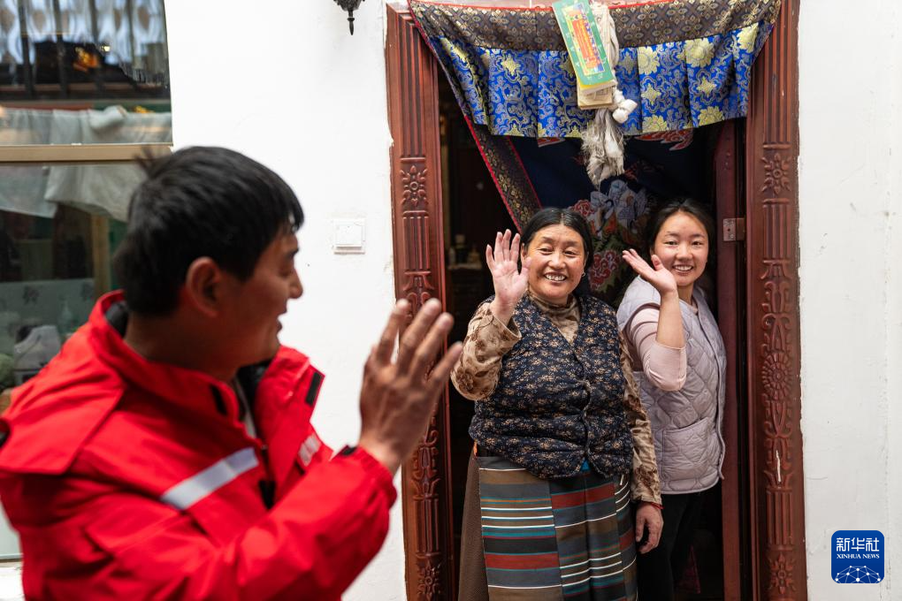 4月26日,西藏錦杭新能源有限責任公司工作人員入戶檢查完供暖情況后和居民道別。新華社記者 丁增尼達 攝