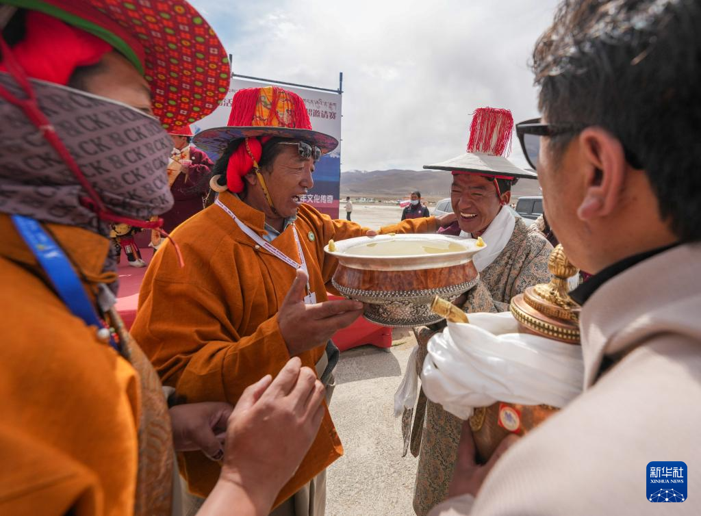 4月27日,獲獎(jiǎng)馬匹的主人(右二)在喝青稞酒,接受祝福。新華社記者 晉美多吉 攝