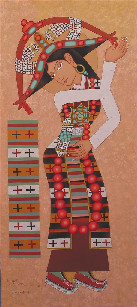 在昂桑“傳統(tǒng)當(dāng)隨時代”的藝術(shù)理念浸潤下,徒弟們總能在傳統(tǒng)與當(dāng)代的碰撞中找到獨(dú)特的表達(dá)坐標(biāo):來自日喀則的藝術(shù)家多吉次旺,早年被昂桑畫作中藏文元素與抽象色塊的融合所震撼。如今在拉薩創(chuàng)辦工作室的他,正將藏文書法的中鋒筆觸解構(gòu)為流動的視覺符號——烏金體的頓挫韻律幻化為色彩的潮涌,在畫布上重現(xiàn)古老史詩的“當(dāng)代心跳”;而主演《文成公主》實景劇的馮佳,這位四川傳媒大學(xué)表演系的畢業(yè)生,跟隨昂桑學(xué)畫四年,已能在《文成公主》系列中將唐卡礦物顏料的莊重與波普藝術(shù)的色塊切割并置,讓歷史人物既保有壁畫般的莊重感,又流淌著屬于時代的視覺節(jié)奏。