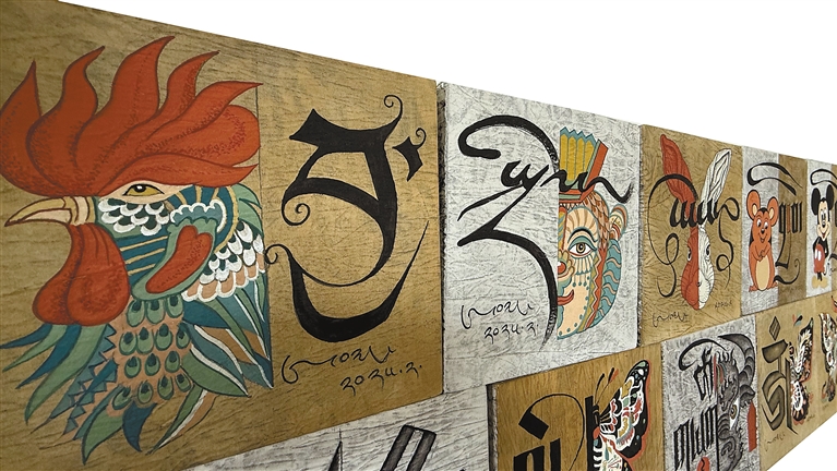 在昂桑的工作室中,《一日一畫》系列尤為醒目:藝術(shù)家采用布面重彩技法,讓唐卡礦物顏料與現(xiàn)代丙烯顏料滲透交融,傳統(tǒng)吉祥紋樣與幾何抽象圖案共生。韓書力評價:“他讓千年顏料與當(dāng)代審美共振,完成傳統(tǒng)藝術(shù)的‘基因重組’?!?/p>