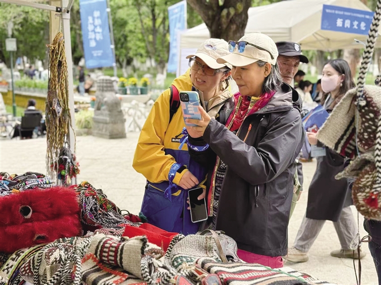 在西藏“非遺”文化體驗(yàn)區(qū),來自湖南的游客張麗一邊挑選包包一邊感嘆:“哇噻,真的太神奇了!沒想到牦牛毛還可以做成這么漂亮的包包,我要多買幾個(gè)帶回去給朋友。還能把這份獨(dú)特的文化記憶帶回家。”