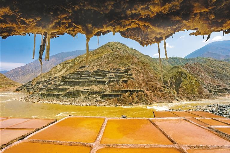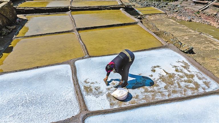 鹽田里,60歲的乃柯正和丈夫一起用木拍夯實(shí)鹽田?!艾F(xiàn)在用泵抽水輕松多了,但拍鹽田的手藝不能丟?!崩先说脑捳Z(yǔ)中,既有對(duì)科技的接納,也有對(duì)傳統(tǒng)的堅(jiān)守。鹽田下方,鹽晶垂落成簾,在山風(fēng)拂動(dòng)下閃爍微光,仿佛在訴說(shuō)著什么。一塊塊鹽田如同一面面鏡子,既映照出千年文明的厚重,也折射著鄉(xiāng)村振興的希望。當(dāng)鹽民們輕掃鹽田,他們掃的不僅是晶瑩的鹽,更是一份在傳承與創(chuàng)新中守護(hù)的鄉(xiāng)愁。