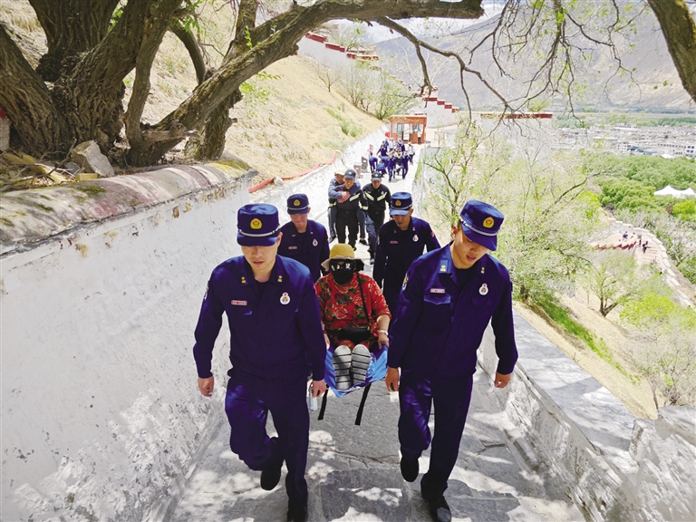 消防員背著身體不適的游客參觀布達(dá)拉宮。