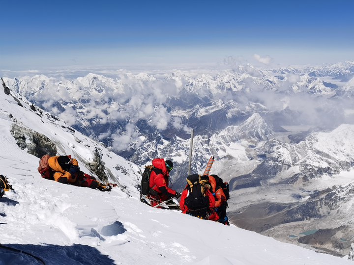 2020年5月27日,2020珠峰高程測(cè)量登山隊(duì)成功登頂世界第一高峰珠穆朗瑪峰。他們?cè)诜屙斬Q立覘標(biāo),安裝GNSS天線,開(kāi)展各項(xiàng)峰頂測(cè)量工作。新華社特約記者 扎西次仁 攝