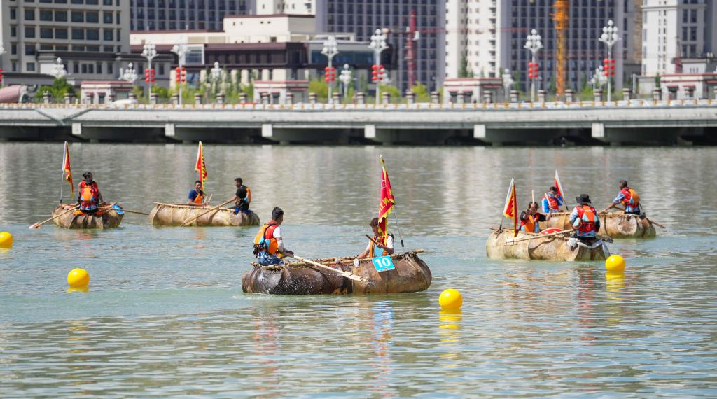↑5月31日,在拉薩市濱河公園旁的水域內(nèi),西藏自治區(qū)端午節(jié)牛皮船賽舉行。新華社記者 晉美多吉 攝