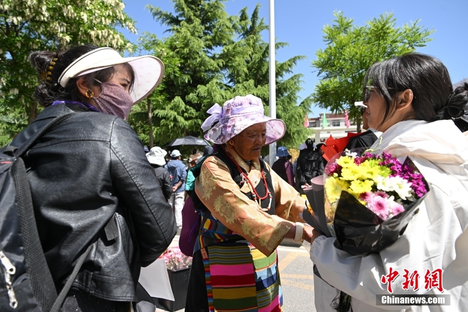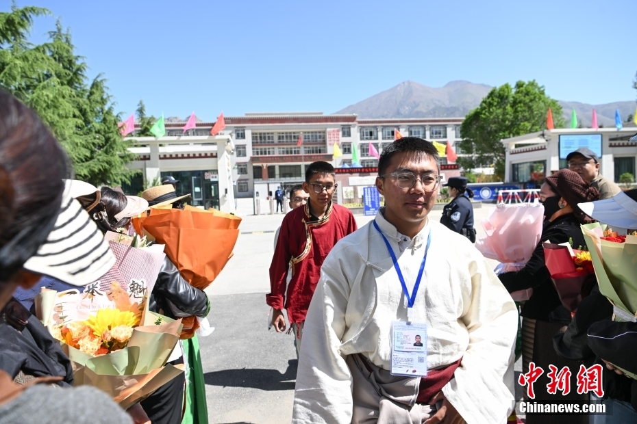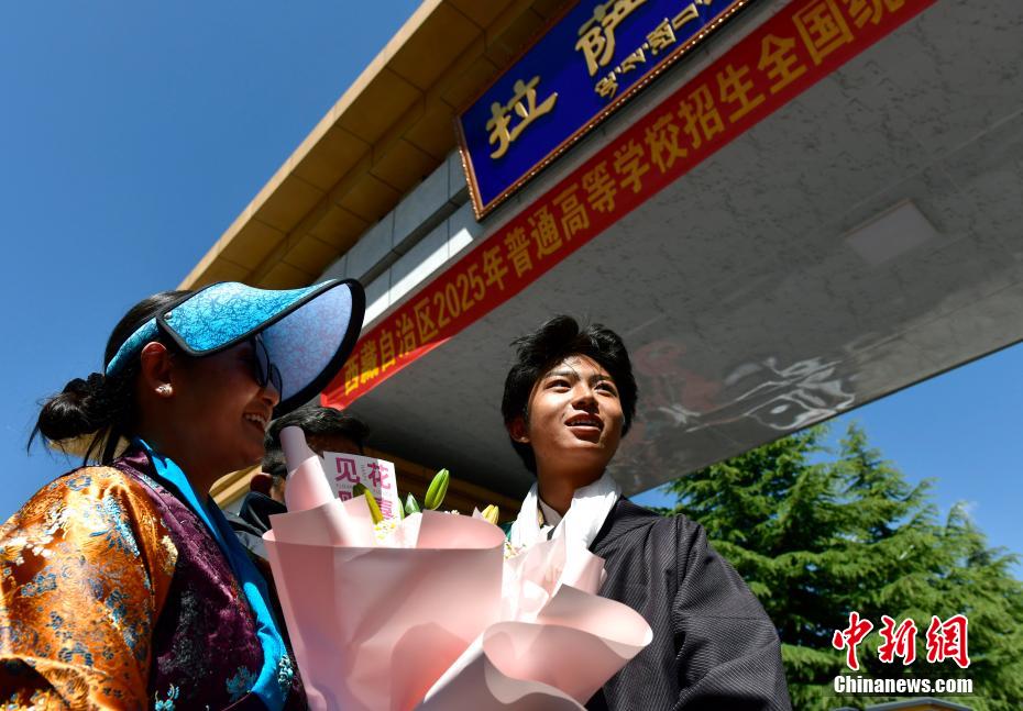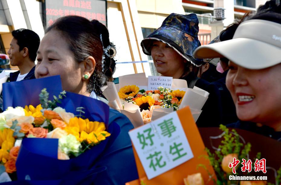 6月9日,西藏拉薩江蘇實驗中學考點外親友為考生送鮮花。當日,西藏自治區(qū)2025年普通高考完成所有科目考試,2025年西藏高考落下帷幕。中新社記者 貢嘎來松 攝