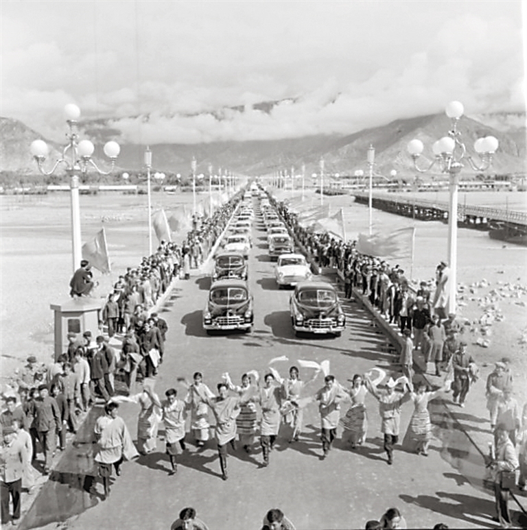 1965年拉薩大橋建成通行時的場景(資料圖片)。