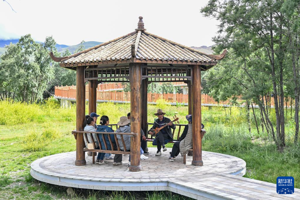 隆子縣居民在沙棘林生態(tài)公園彈奏樂(lè)器。新華社記者 李鑫 攝