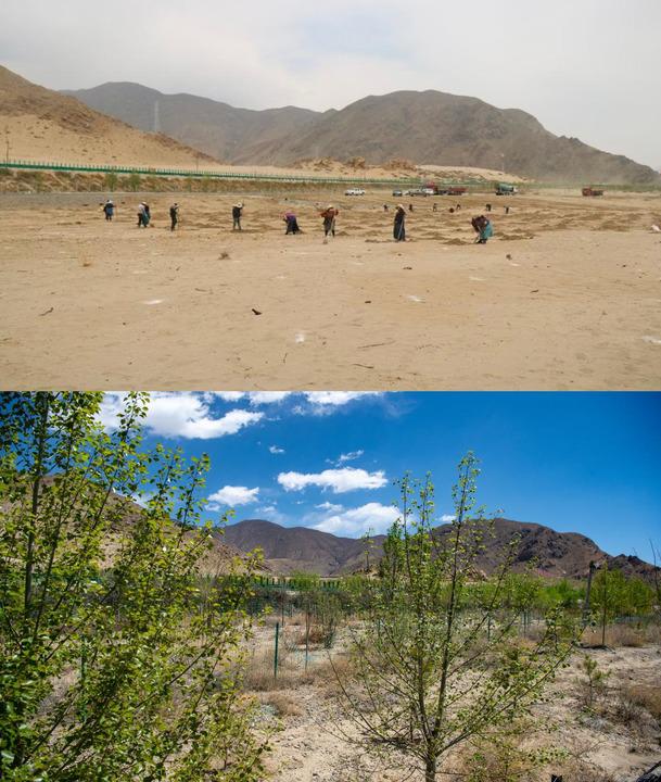 這是一張拼版照片。上圖為西藏山南市貢嘎縣境內拍攝的“先造后補工程”(2021年攝);下圖為西藏山南市貢嘎縣境內拍攝的拉薩南北山造林綠化(貢嘎段)(2025年4月24日攝)。新華網 旦增努布 攝