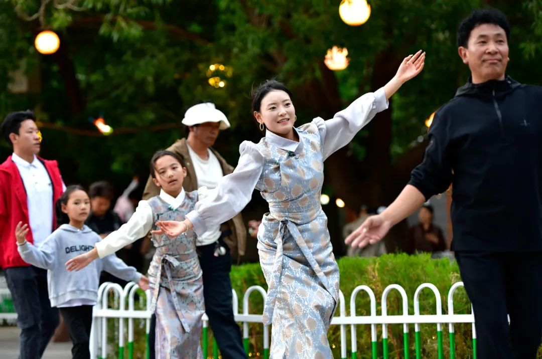 7月13日,西藏昌都瀾滄江天津廣場(chǎng)上,鍋莊舞愛(ài)好者踏歌起舞,舞出夏日夜間精彩。