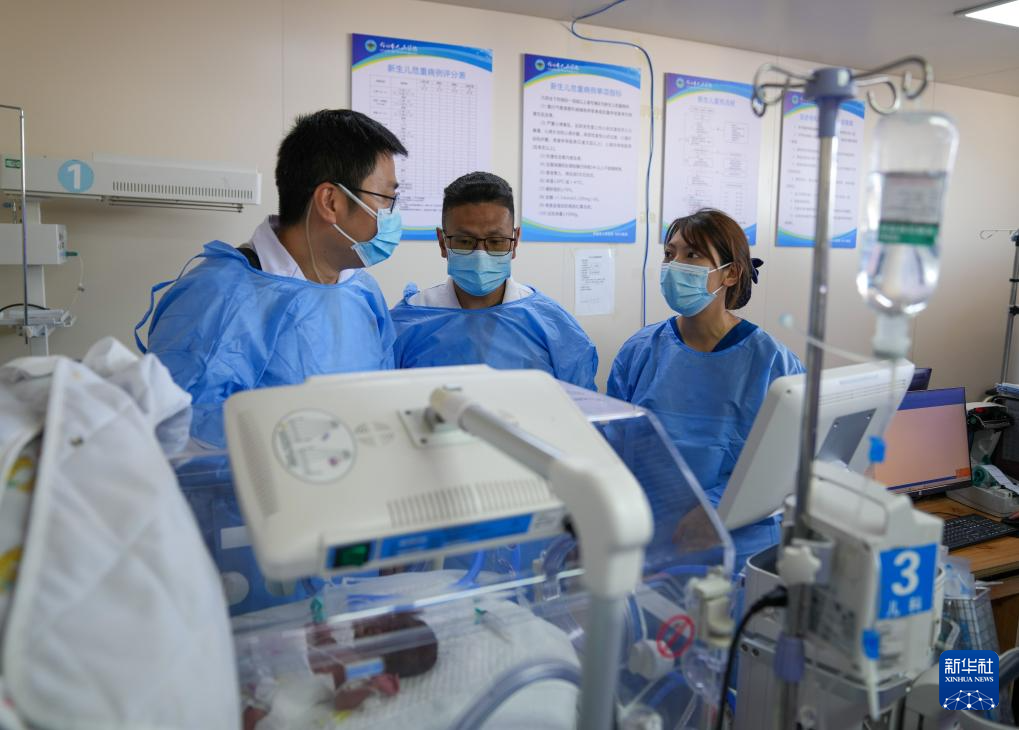 在那曲市人民醫(yī)院新生兒重癥監(jiān)護室,來自大連醫(yī)科大學(xué)附屬第一醫(yī)院的援藏醫(yī)生田聰亮(左)與吉美多布杰(中)、護士旦珍合作,為一名早產(chǎn)兒實施機械通氣治療(7月18日攝)。吉美多布杰2003年從四川大學(xué)華西醫(yī)學(xué)院畢業(yè)來到那曲市人民醫(yī)院工作,他先后和8批援藏專家合作、學(xué)習(xí)。新華社記者 晉美多吉 攝