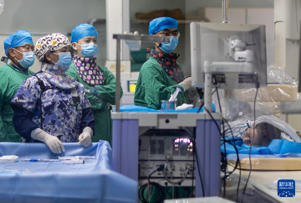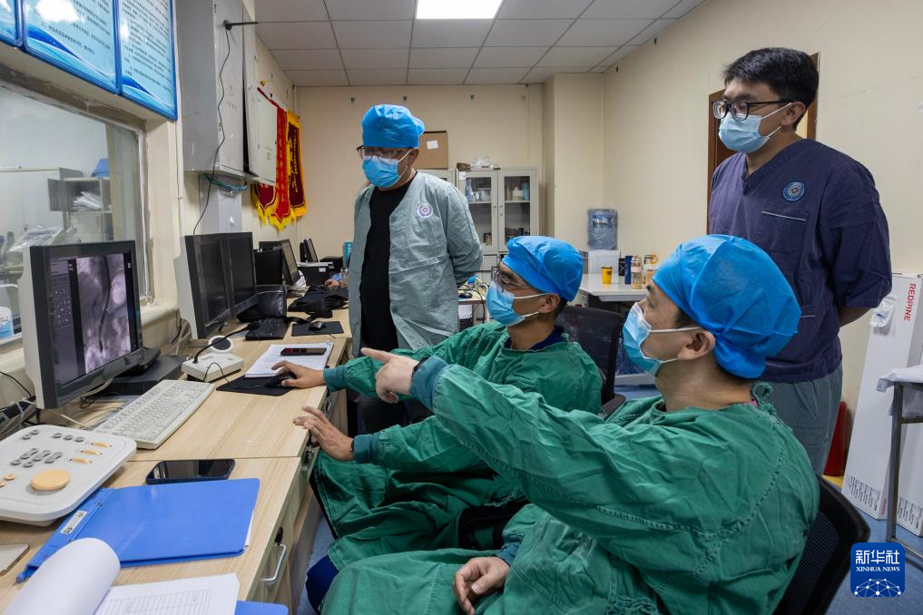 協(xié)和醫(yī)院第十批援藏醫(yī)生王強(左四)、第十一批援藏醫(yī)生蔣青偉(左三)和西藏自治區(qū)人民醫(yī)院醫(yī)生扎西(左一)在拉薩為患者施行內(nèi)鏡逆行胰膽管造影術(shù)(8月5日攝)。新華社記者 姜帆 攝