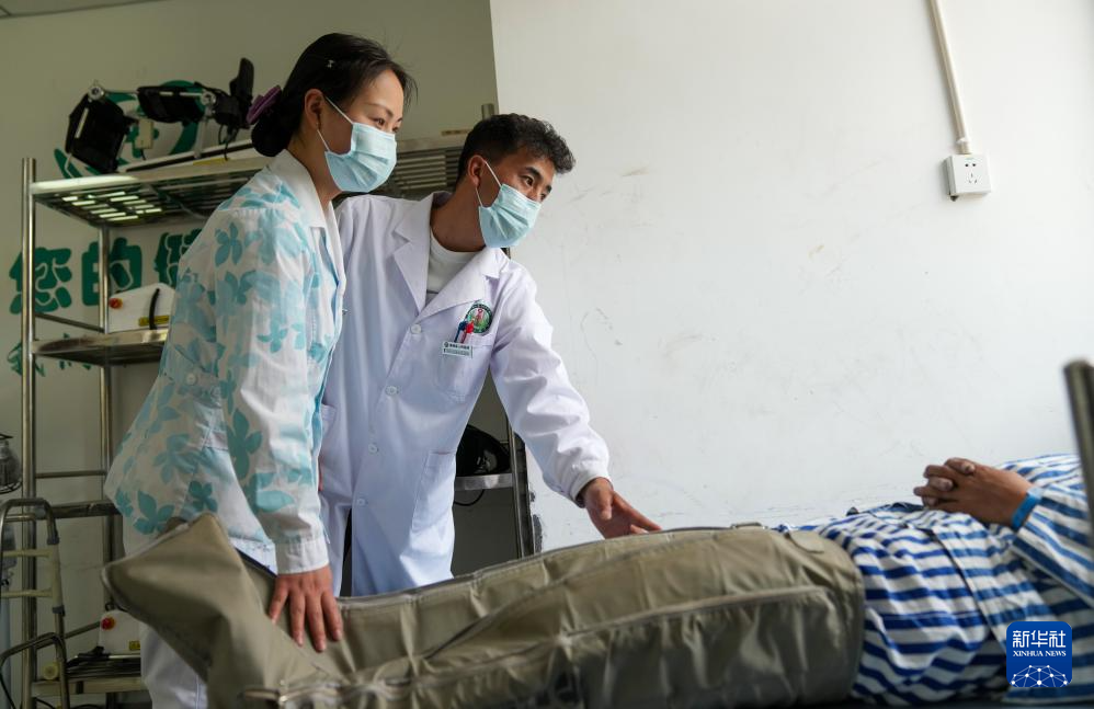 在昌都市洛隆縣人民醫(yī)院,從西藏大學(xué)醫(yī)學(xué)院畢業(yè)的醫(yī)生巴桑扎西和護士為患者進行康復(fù)治療(7月21日攝)。新華社記者 晉美多吉 攝