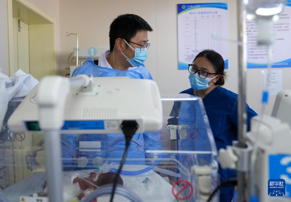 在那曲市人民醫(yī)院新生兒重癥監(jiān)護室,來自大連醫(yī)科大學(xué)附屬第一醫(yī)院的援藏醫(yī)生田聰亮(左)和護士旦珍合作為一名早產(chǎn)兒實施機械通氣治療(7月18日攝)。新華社記者 晉美多吉 攝