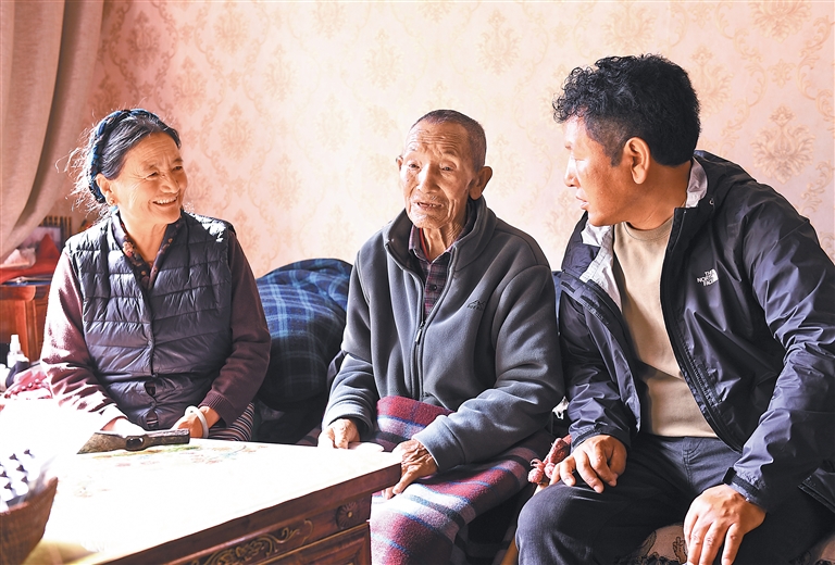 圖為羅布多吉老人(中)與家人在一起。 記者 旦增蘭澤 洛桑 攝