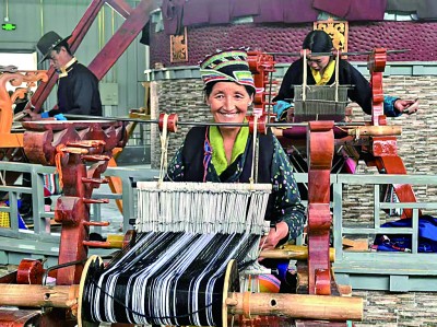 西藏山南市乃東民族嘩嘰手工編織專業(yè)合作社內(nèi),村民們正在編織純手工的澤帖爾。光明日?qǐng)?bào)記者 李丹陽攝/光明圖片