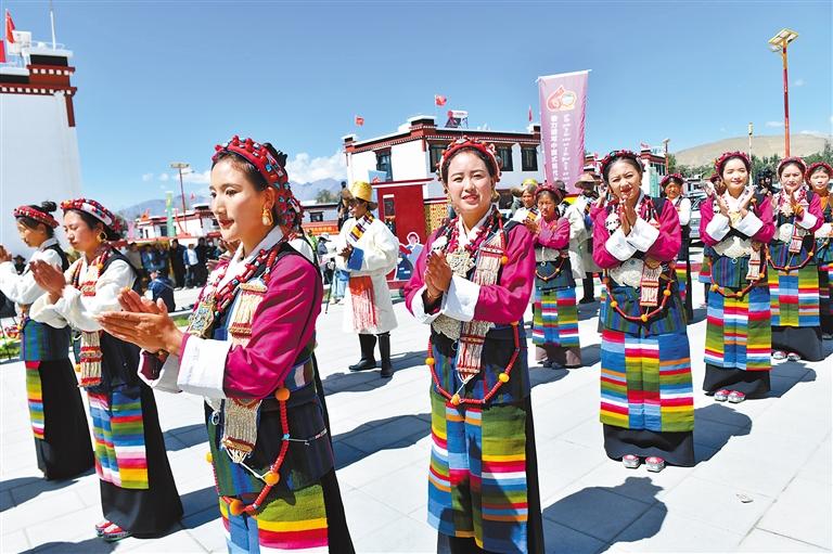 定日縣森嘎村會(huì)場(chǎng),身著盛裝的群眾慶祝喜遷新居。記者 王敏 攝