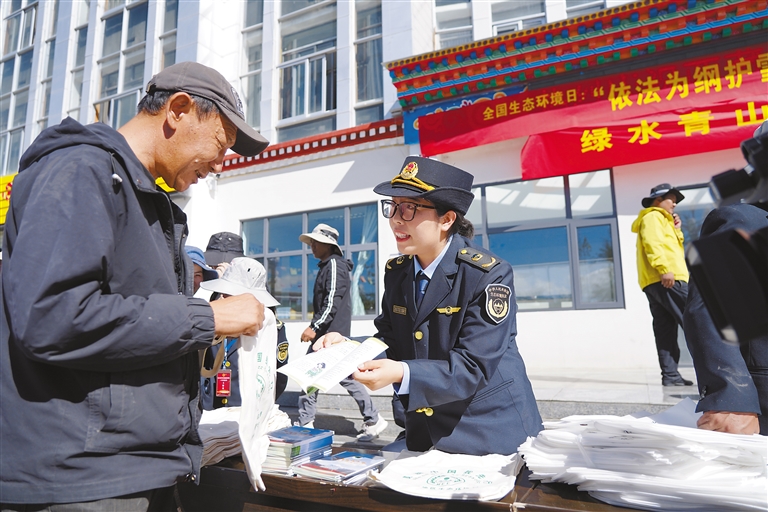 在法規(guī)宣講環(huán)節(jié),工作人員通過設(shè)立宣傳展板、懸掛宣傳橫幅、發(fā)放政策法規(guī)手冊、現(xiàn)場接受群眾咨詢答疑等形式,向群眾集中宣傳《中華人民共和國青藏高原生態(tài)保護法》及自治區(qū)實施辦法等生態(tài)環(huán)保法律法規(guī)。