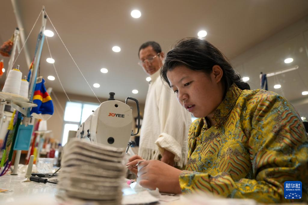 洛桑麥朗(右)在學(xué)校指導(dǎo)學(xué)徒裁剪布料(8月15日攝)。新華社記者 晉美多吉 攝