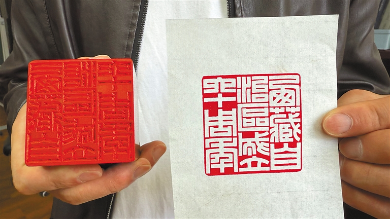 徐帥正在欣賞自己的篆刻作品。