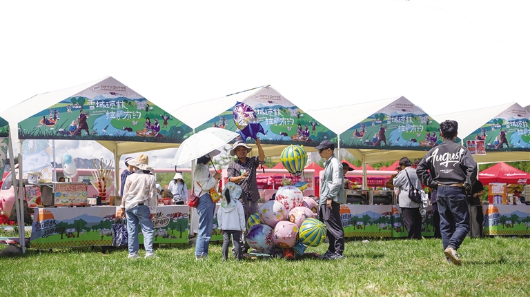 記者看到,綠野市集“沖賽康”充滿了煙火氣,30余家特色攤位齊聚林間。這里不僅有藏式甜茶、糌粑制品等傳統(tǒng)美食,讓游客大飽口福,還有氆氌文創(chuàng)、非遺手作等特色產品,滿足游客的購物需求。此外,互動游戲與民俗體驗也吸引了眾多游客參與,營造出充滿活力的林卡生活場景。