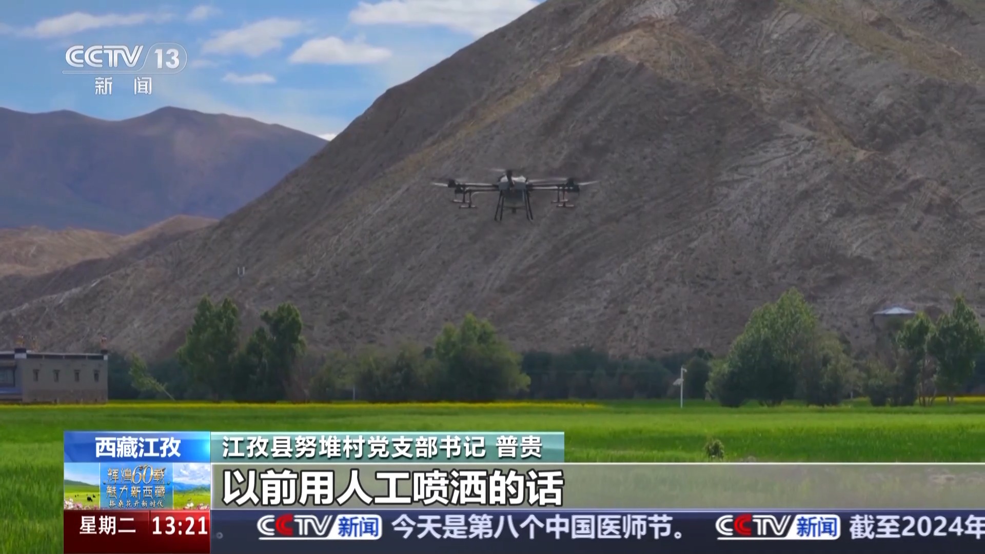 西藏日喀則市江孜縣努堆村黨支部書記 普貴:這幾天我們正在給青稞噴灑葉面肥,以前人工噴灑,一畝地需要半小時左右。現(xiàn)在用無人機,半小時能噴灑30多畝地,我們村的2500多畝地大概需要兩天就能完成。
