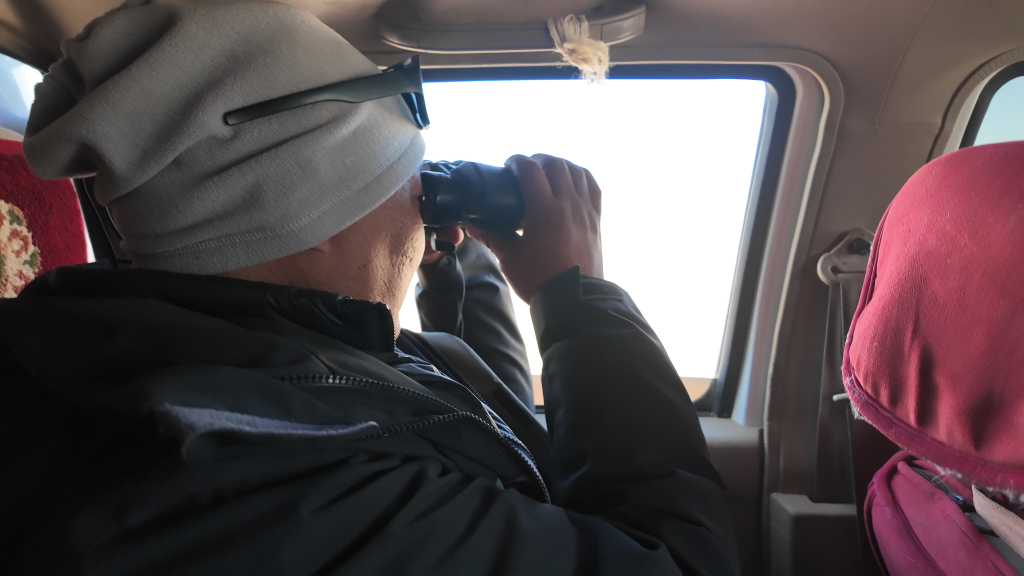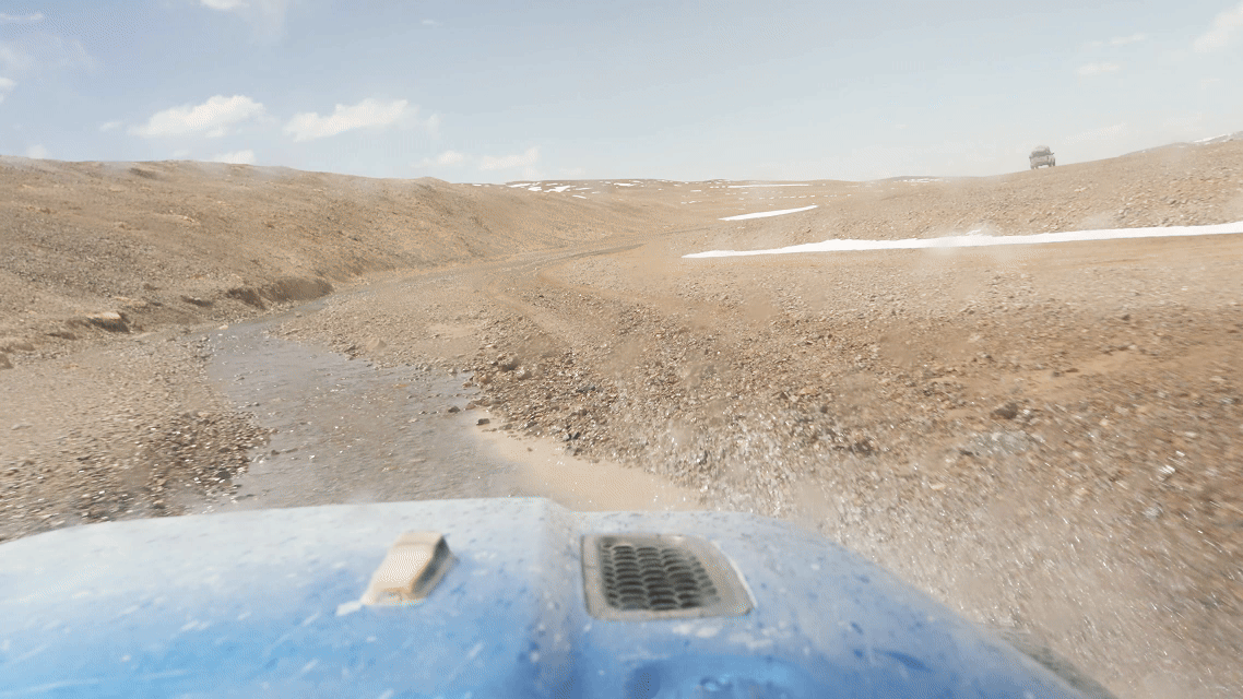 為了拍下野保員的日常工作以及藏羚羊大遷徙的宏大場(chǎng)面,我們一行跟隨巡護(hù)車,向著保護(hù)區(qū)核心區(qū)進(jìn)發(fā)。路面逐漸從“蜿蜒崎嶇的溪流”變成“波濤洶涌的大?!保揭败噧?nèi)好像一個(gè)迪斯科舞池,每一件東西都像被賦予了生命一般蹦蹦跳跳,伴隨著我們這些乘客的驚呼,連同引擎的轟鳴一起,揉碎在無邊荒原的呼嘯風(fēng)聲中。