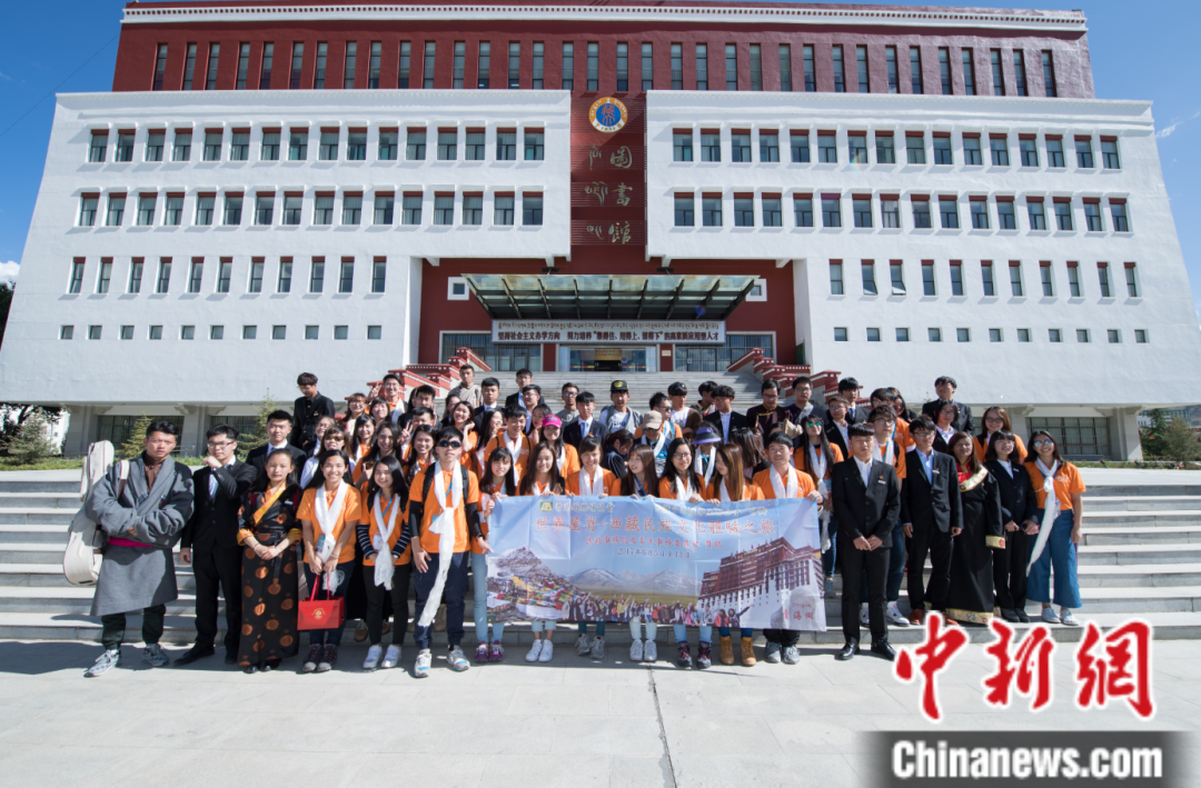 圖為2017年6月8日,香港青少年代表團(tuán)與西藏大學(xué)學(xué)生代表在西藏大學(xué)圖書館前合影留念。中新社記者 何蓬磊 攝