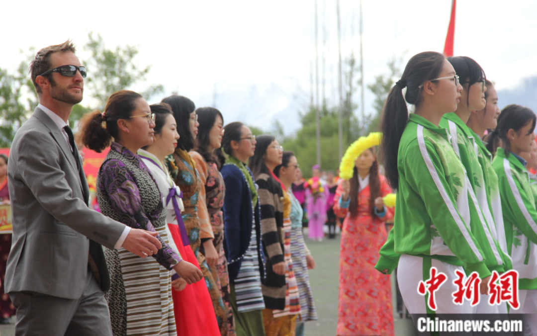 2017年5月11日,西藏大學(xué)舉行第二十八屆田徑運(yùn)動(dòng)會(huì),數(shù)十名外籍留學(xué)生和外籍教師參加了開幕式。圖為開幕式中旅游與外語(yǔ)學(xué)院方隊(duì) 劉蔭 攝