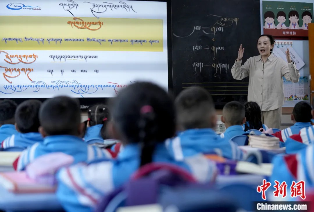 2025年3月10日,拉薩市第一小學(xué)藏語文老師桑旦旺姆使用科技設(shè)備在課堂上講授藏語。中新社記者 李林 攝