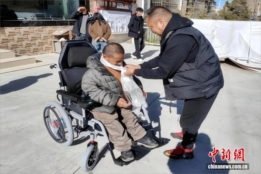 扎西平措為巴熱村殘障人士發(fā)放輔助設備。 受訪者供圖