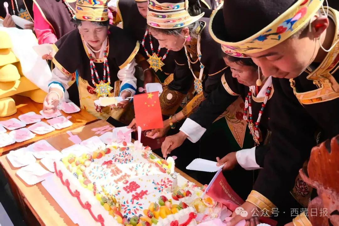 圖為林芝市巴宜區(qū)林芝鎮(zhèn)嘎拉村群眾歡聚一堂,分享寫有“幸福嘎拉村”的蛋糕。記者 王珊 謝筱純 攝