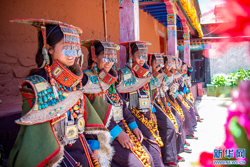 身著“普蘭服飾”的普蘭縣科迦村村民(6月10日攝)?!捌仗m服飾”,主要由袍子、披風(fēng)、頭飾、項(xiàng)鏈、腰帶、耳墜、靴子組成。其中最精美、最獨(dú)特的為婦女服飾,外形設(shè)計(jì)如同孔雀開(kāi)屏,被譽(yù)為“孔雀”服飾,一套重達(dá)20多公斤,裝飾有黃金、白銀、蜜蠟、珊瑚、綠松石等。新華網(wǎng) 旦增努布 攝