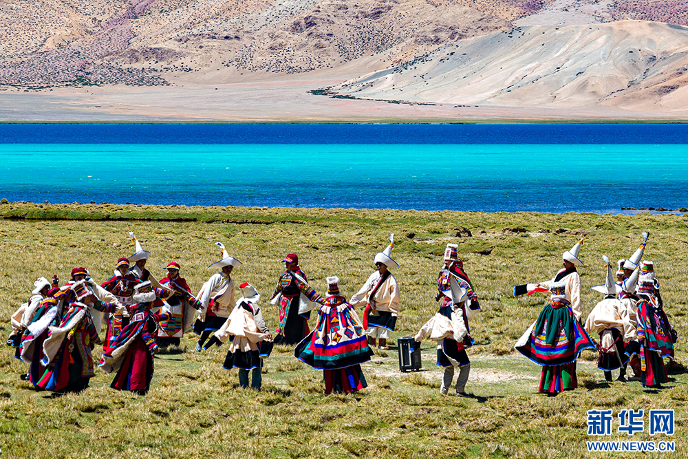 身穿自治區(qū)級(jí)非物質(zhì)文化遺產(chǎn)“森郭服飾”的改則縣群眾在湖畔跳鍋莊(6月21日攝)?!吧棥北蛔u(yù)為“五彩彩虹服”,主要由紅、綠、黑、黃、藍(lán)五種顏色的氆氌制成。新華網(wǎng) 旦增努布 攝