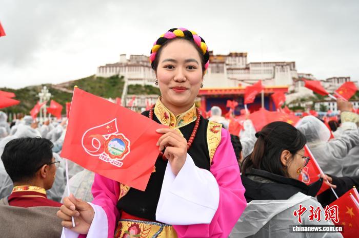 8月21日,拉薩古城居民羅桑群佩在布達(dá)拉宮廣場參加慶?;顒?dòng)。中新社記者 趙朗 攝