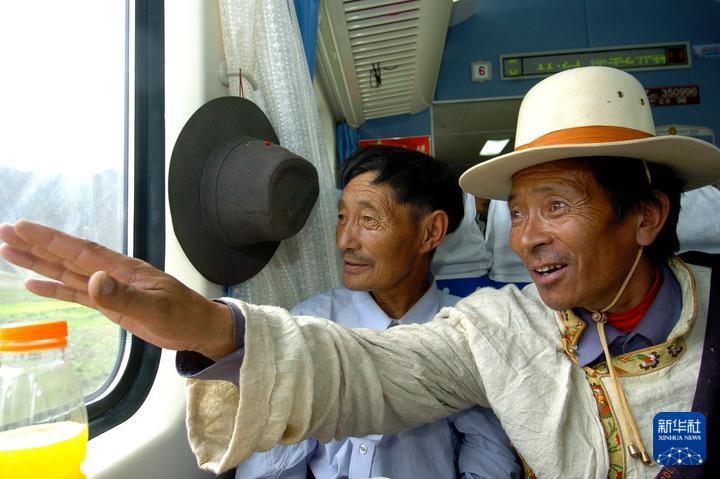 2006年7月1日,烏金(右一)乘坐的“藏2”次列車經過自己家鄉(xiāng)安多時,興奮地指向車外,向同伴介紹。