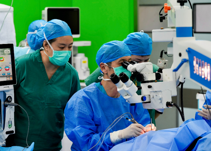 魏文斌帶領(lǐng)的眼科專家團(tuán)隊(duì)手術(shù)及帶教現(xiàn)場(chǎng)(施術(shù)者為史翔宇教授)
