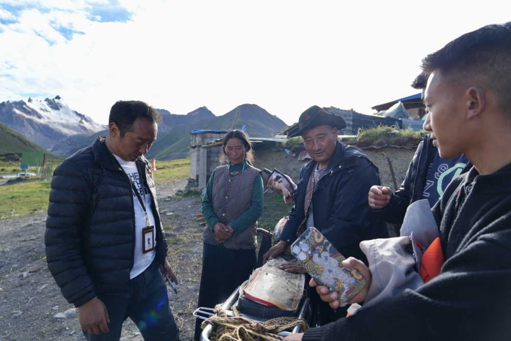 圖為巴登求扎團(tuán)隊(duì)工作人員與牧民交談。 何欣然攝