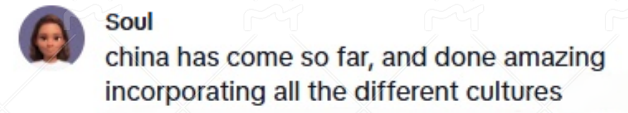 網(wǎng)友@Soul指出,“中國已經(jīng)取得了長足的進(jìn)步,在融合各種不同文化方面做出了令人驚嘆的成就?!?/p>